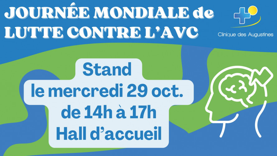 À l’occasion de la Journée mondiale de lutte contre l’Accident Vasculaire Cérébral (AVC), la Clinique des Augustines s’associe à cette action de prévention en organisant un stand d’information et de sensibilisation ouvert à tous : patients, proches et visiteurs le mercredi 29 octobre 2025, de 14h à 17h, au standard de la Clinique.